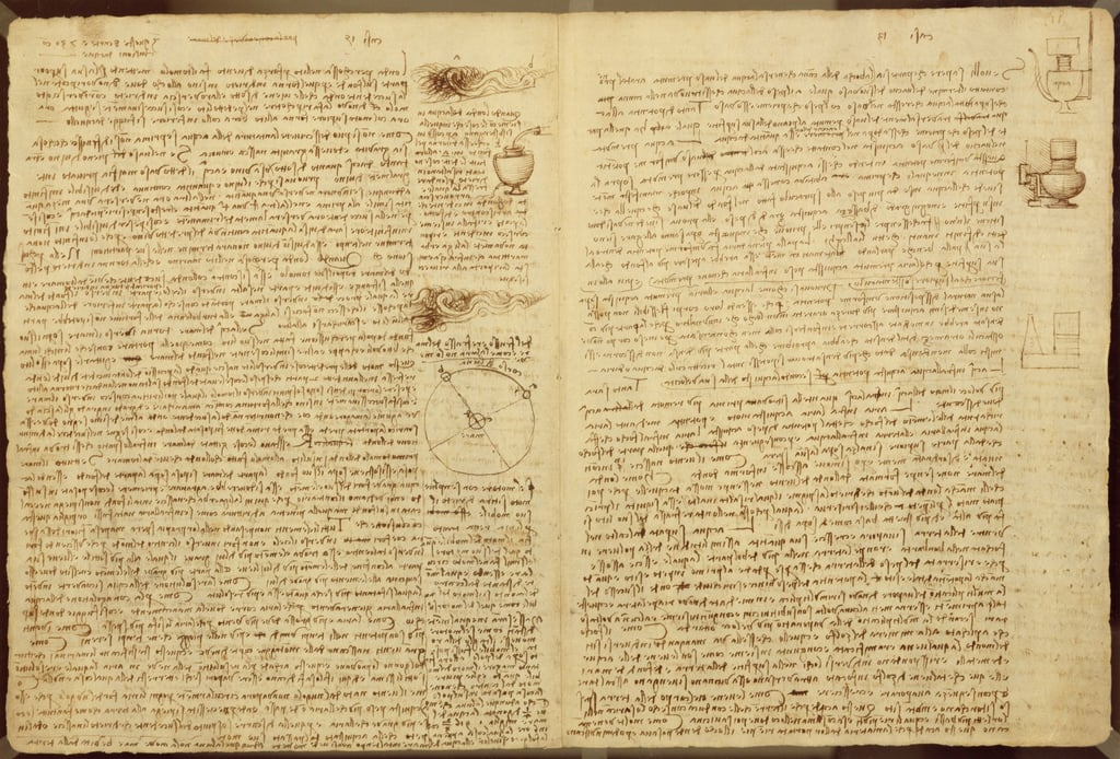 En la página del códice Leicester que se muestra aquí, su forma de trabajar es evidente. Da Vinci rellenó miles de hojas con sus comentarios, sus experimentos, sus conclusiones y todo aquello que podía considerar útil para su propio aprendizaje. Al considerar más importante la imagen que el texto, son pocas las páginas donde sólo hay texto y en cambio, son muchas donde sólo hay imagen. En este ejemplo, los pequeños dibujos realizados por Leonardo completan el texto.
