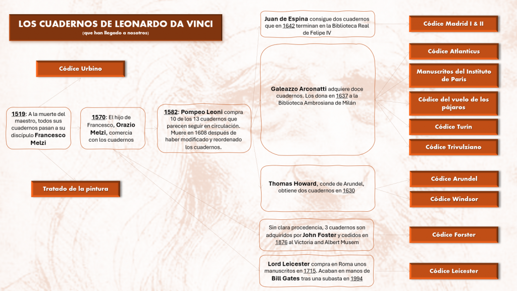 Son más de 5000 páginas las que, a dia de hoy, se pueden admirar de los cuadernos y códices de Leonardo da Vinci. Divididas en 10 códices u obras principales y diseminadas por todo el mundo, su visualización y estudio siguen sin dejar a nadie indiferente.